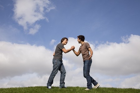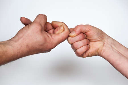 Hand of man and woman solve a conflict with Fingerhakeln.