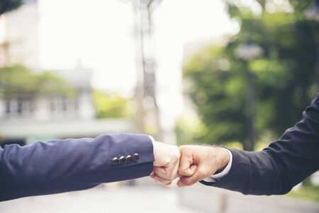 Business partners giving fist bump after complete a deal. Successful teamwork with hands gesture communication.
