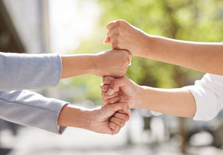 The diversity business hand fist bump symbolises teamwork, collaboration or solidarity in the workplace. A group of people and hand sign symbolise community, cooperation or inclusion.