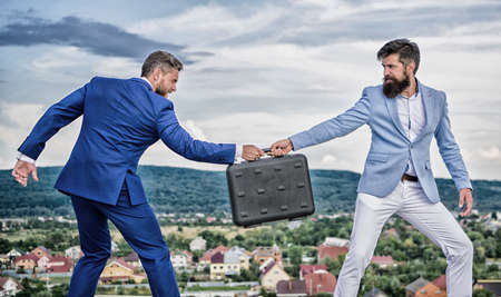 Fraud and extortion concept. Rascal racketeer extortionist cheating handover. Men suits handover briefcase. Business deal landscape background. Businessman takes away briefcase from business partner