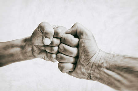 Clash of two fists on toned background. Concept of confrontation, fight, domestic violence. Black and white.