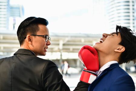 Concept Business people playing sports, business man wearing boxing gloves throwing a punch