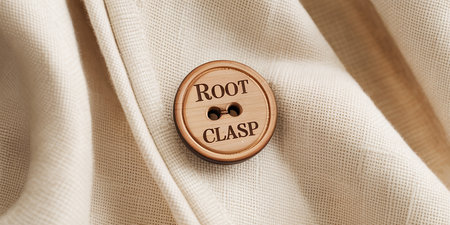 A close-up shot of a round wooden button with the words ROOT CLASP engraved on it Clear details and vibrant co...