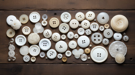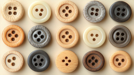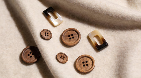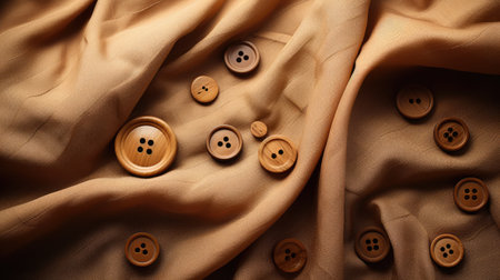 This sophisticated still life embodies a warm, tactile mood through layered textures and subtle nutty glow, achieved via precise digital rendering techniques for depth and dimension. Suited for fashion designers showcasing button alternatives, textile artisans developing material palettes, or lifestyle brands highlighting natural craftsmanship in brochures, websites,... AI-generated illustration.