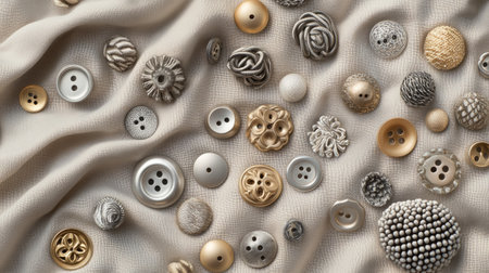 A stunning array of decorative buttons displayed on a soft fabric surface, perfect for inspiring creativity in fashion designs and craft projects.