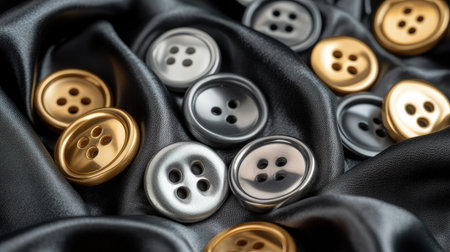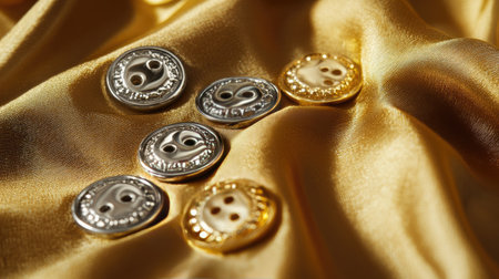 These elegant buttons beautifully contrast against the luxurious golden fabric, creating a striking visual appeal ideal for fashion and design applications.