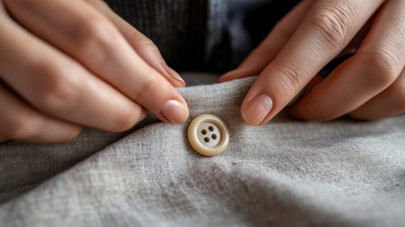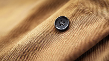 A detailed close-up view showcases a black button on a textured brown fabric. The natural light highlights the stitching and seams, emphasizing craftsmanship.