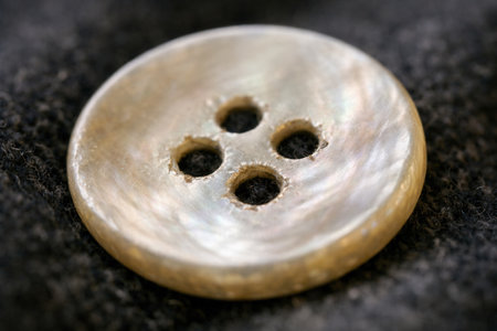 Iridescent Pearl Button With Four Holes Resting On Dark Fabric
