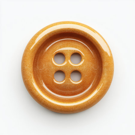 This image showcases a close up view of a smooth, glossy wooden button featuring four holes, perfect for sewing, crafting, or textile design inspiration.