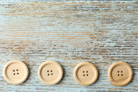 Many sewing buttons on light wooden background, flat lay. Space for text