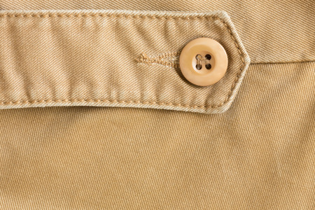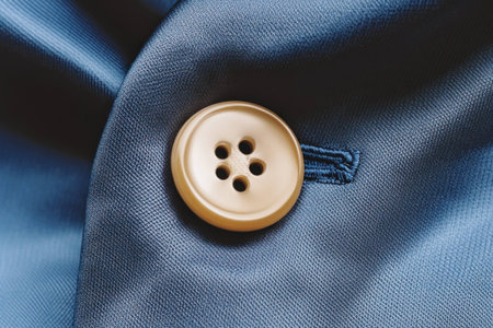 Close up of a stylish beige button on a blue tailored jacket fabric, showcasing details, elegance, and fashion design Perfect for clothing and textile concepts