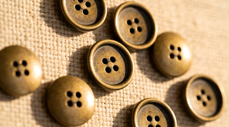 A creative digital illustration depicting Brass buttons with natural patina scattered on burlap, macro closeup, golden hour light, metallic bronze and neutral backdrop, detailed shine, professional photography style. This AI-generated artwork features unique visual elements suitable for various commercial and editorial applications. AI-generated illustration.