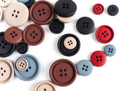 Pile of color brown, beige, gray, red, black plastic matte buttons on white, beautiful needlework, minimalism. Use for sewing. Space for text.