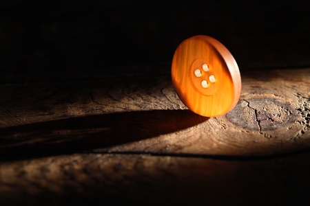 Large black button sitting on a dark wooden surface, possibly for sewing or crafts