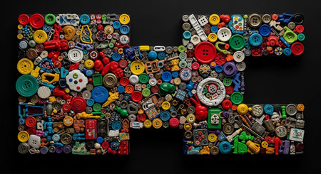 An H-shaped arrangement of colorful buttons and small craft is presented against a dark background. The composition is meticulously organized, with the various filling the distinct sections of the H. A wide spectrum of button colors, sizes, and textures is visible, alongside miniature toy figures, beads, and other assorted The overall impression is one of playful creativity and detailed craftsmanship, with the geometric structure providing a sense of order to the vibrant collection.
