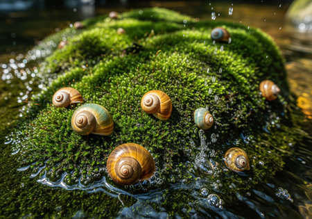 A macro view showing multiple small, polished snail shells scattered across a lush, wet emerald green mossy rock, highlighted by splashing water droplets.