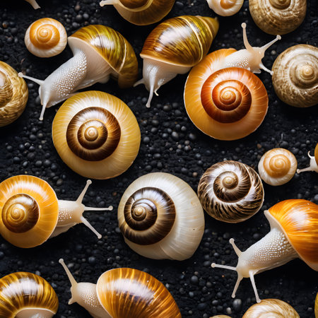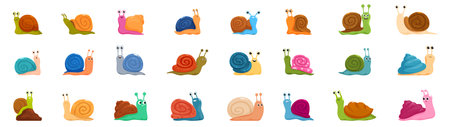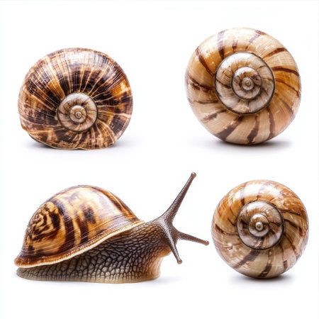 Collection of detailed garden snails with eyestalks extended and banded shells isolated on white for seamless design integration in nature graphics, educational materials, or pest awareness campaigns. Perfect for wildlife illustrations, organic garden themes, and biology visuals to captivate audiences.