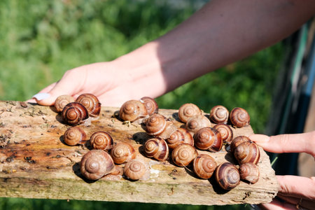 bunch of hand-picked grape snails. Grape snail farm for restaurants. mollusk on wooden plank.
