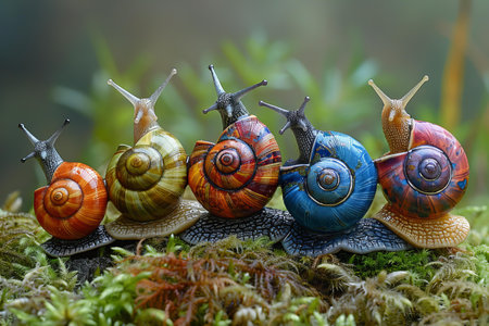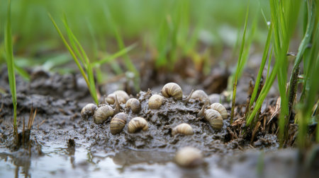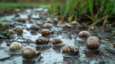 This image captures snails crawling on wet muddy ground, showcasing their intricate shells and slow movement. Ideal for nature and wildlife themes.