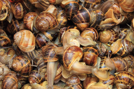 Closeup of fresh edible snails with spiral striped shells commonly used in Mediterranean cuisine