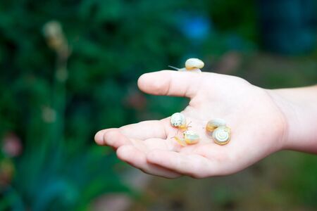 A little snail crawling on the human hand on summer nature background in the park. Ecology concept.
