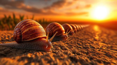 A line of snails are lined up in a row on the ground, AI
