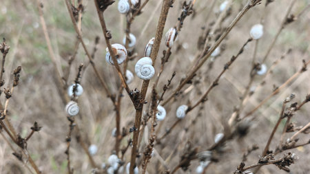 Snails on dry branches in natural environment