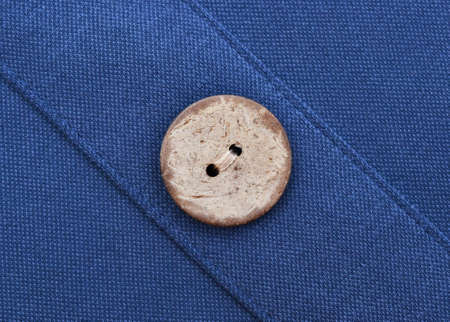 Beautiful texture with a round button for sewing, needlework. Copy space. Flat lay. Blue background.