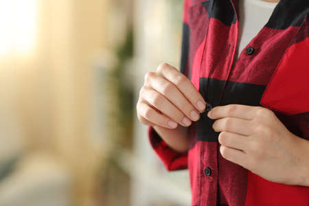 Close up of a teen hand dressing fastening button of shirt standing at home
