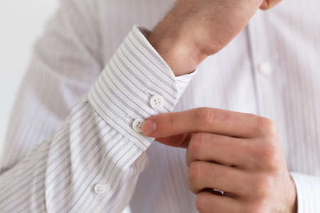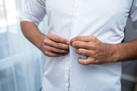 Man buttoning his shirt close up