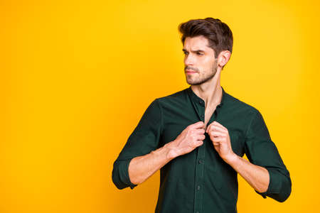 Profile side photo of serious stunning rich wealthy guy millionaire adjust button on his shirt look attract girls on summer weekends wear modern outfit isolated over yellow color background