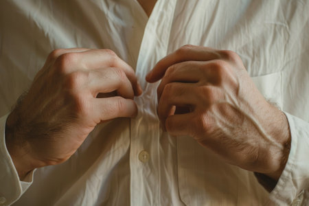 close-up of hands buttoning a white dress shirt