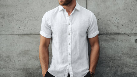White short sleeve shirt mockup on male model posed casually against a textured concrete wall