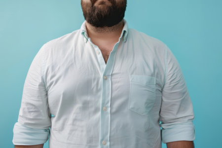 The body of a fat man in a white shirt on a blue background. An overweight man in a white shirt.