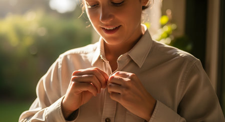 Close-up of a smiling woman fastening the buttons of her beige shirt while getting dressed. The warm lighting suggests a calm morning routine and attention to detail in personal grooming.