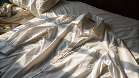 Morning light drip on a crumpled white shirt crease unmade bed soft home environment close-up concept