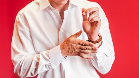man fastens buttons on his shirt