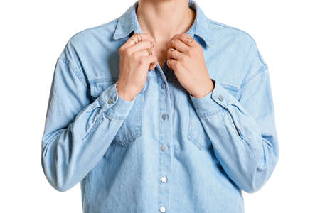 Beautiful young woman in jeans clothes on white background