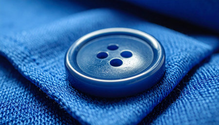 A sharp macro photograph showcasing a bright blue four-hole button fastened to a textured blue fabric with visible stitching.