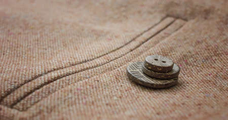 Explore the intricate beauty of vintage wooden buttons on textured fabric. This close-up captures the elegance and craftsmanship of classic fashion elements.