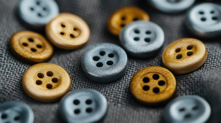 This close-up image showcases a collection of colorful buttons in shades of gold and silver arranged on fabric, ideal for sewing and crafting projects.