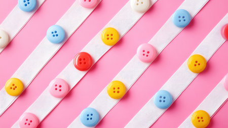 Vibrant buttons arranged on a pink background create a playful and colorful scene perfect for craft projects, sewing inspirations, and creative designs.