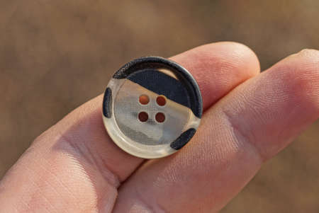 fingers hold one gray black plastic button on a brown background