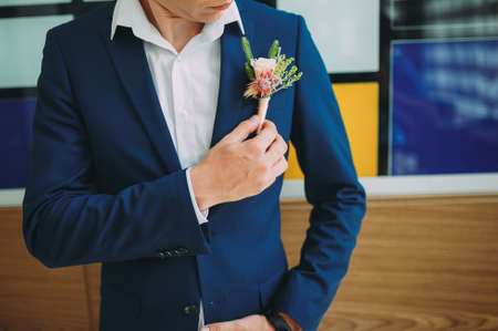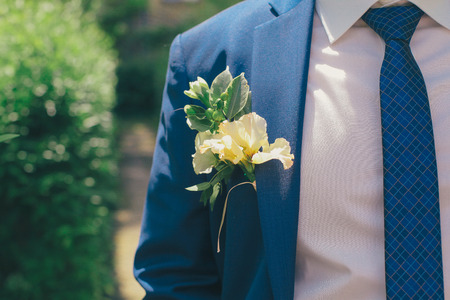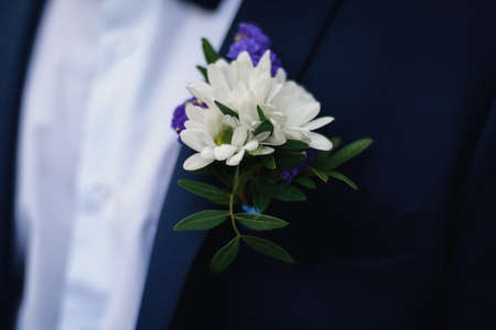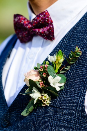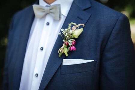 Details of male wedding clothes. Beautiful boutonniere pinned on man in blue suit, white shirt and blue bow tie.