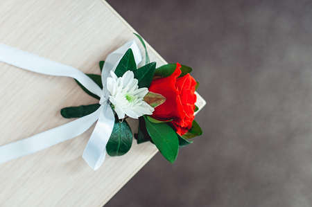 little wedding boutonniere with roses with white ribbon