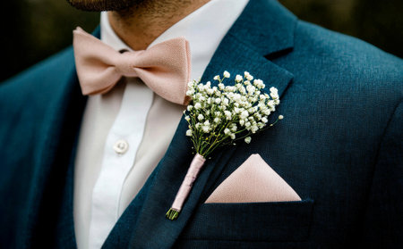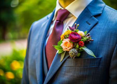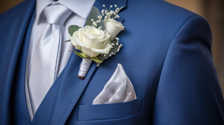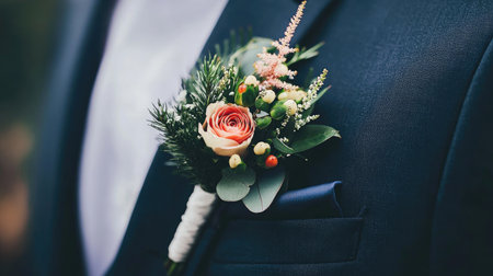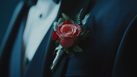 A beautifully crafted wedding boutonniere adorns the groom's lapel, adding an elegant touch to his formal attire.