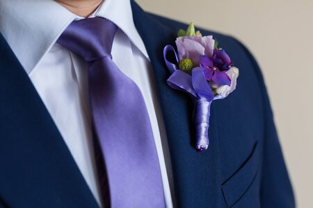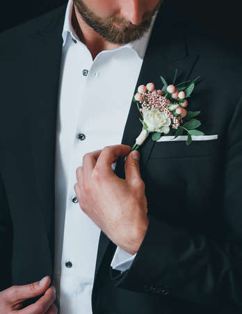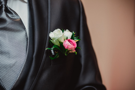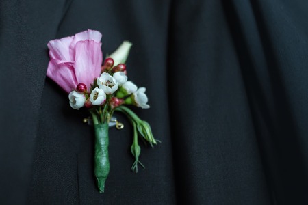 Very beautiful buttonholes on the jacket of a young and handsome groom
