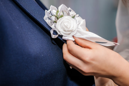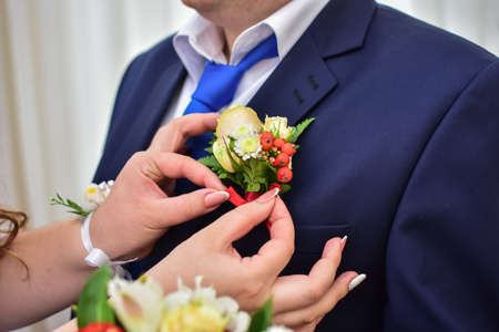 Hands of the bride in wedding gloves touch the decoration in the form of a rose flower on a blue suit of the groom, close-up.