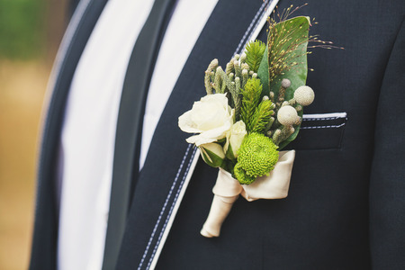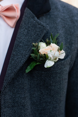 Boutonniere, groom wearing flowers on his jacket