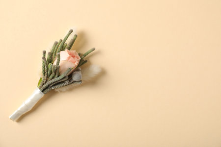 Boutonniere on beige background, top view. Space for text